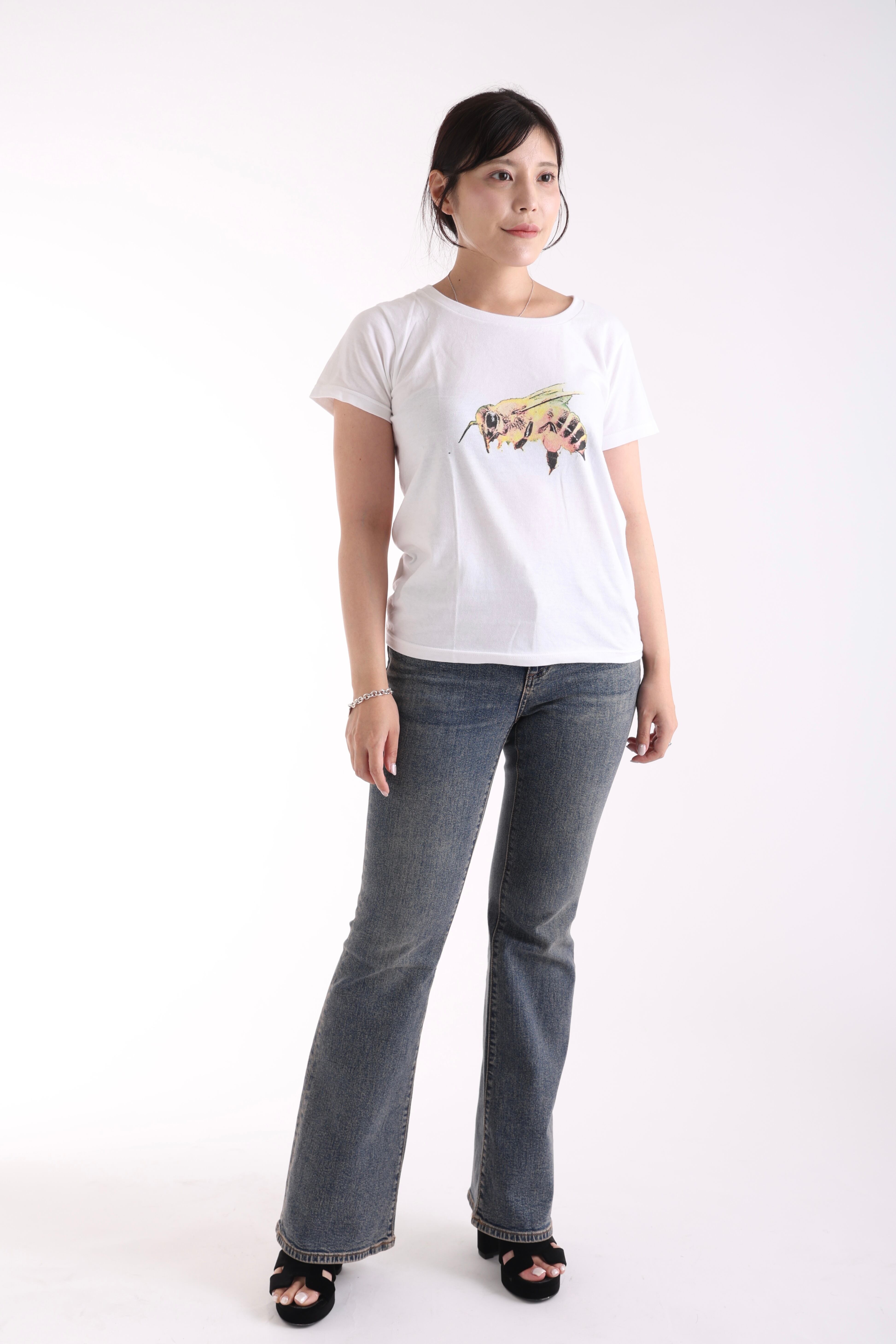 真ん中にニホンミツバチがあしらわれたUネックのTシャツです。