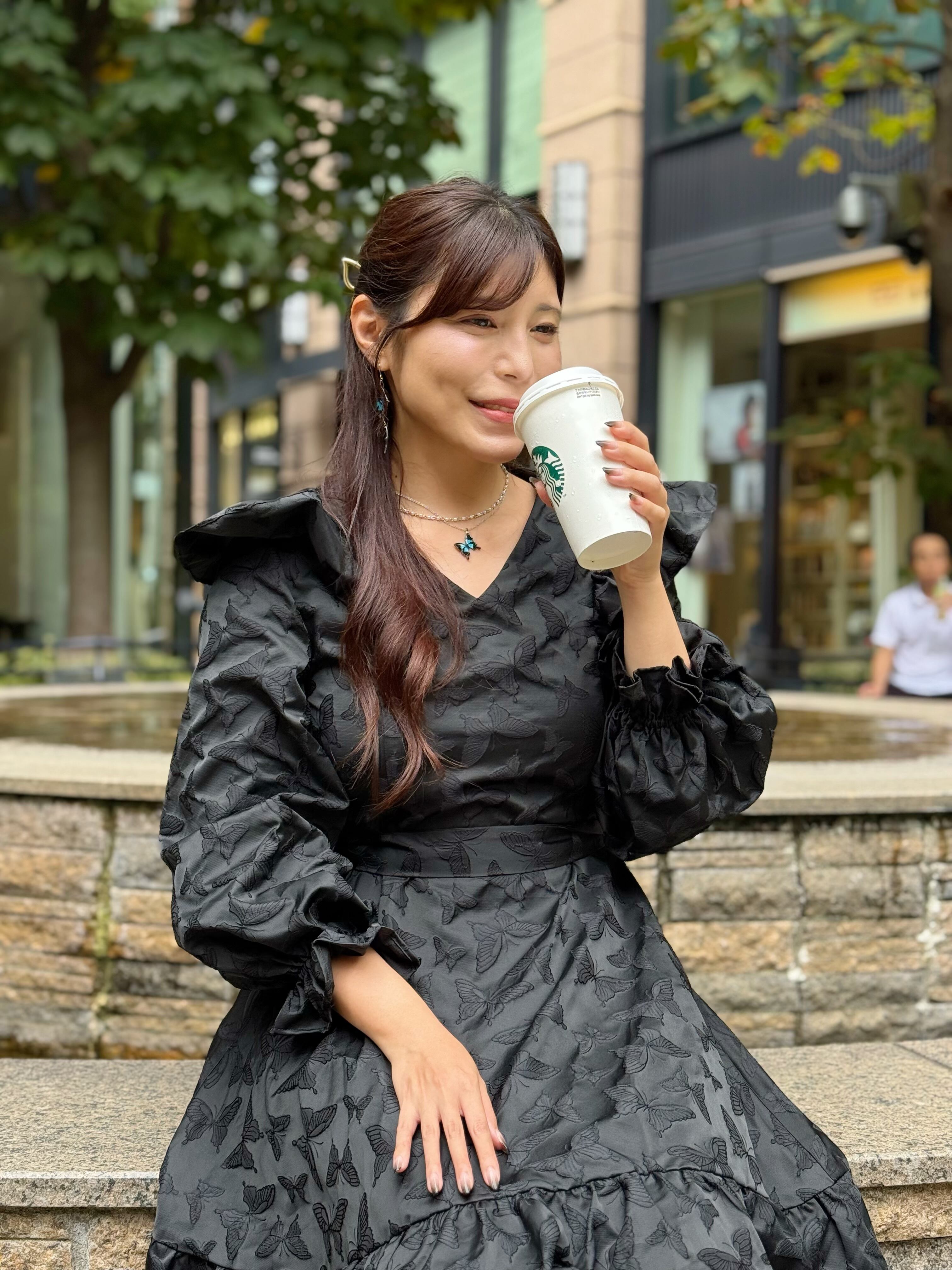 黒のジャガード生地にチョウがギッシリ散りばめられたワンピース。