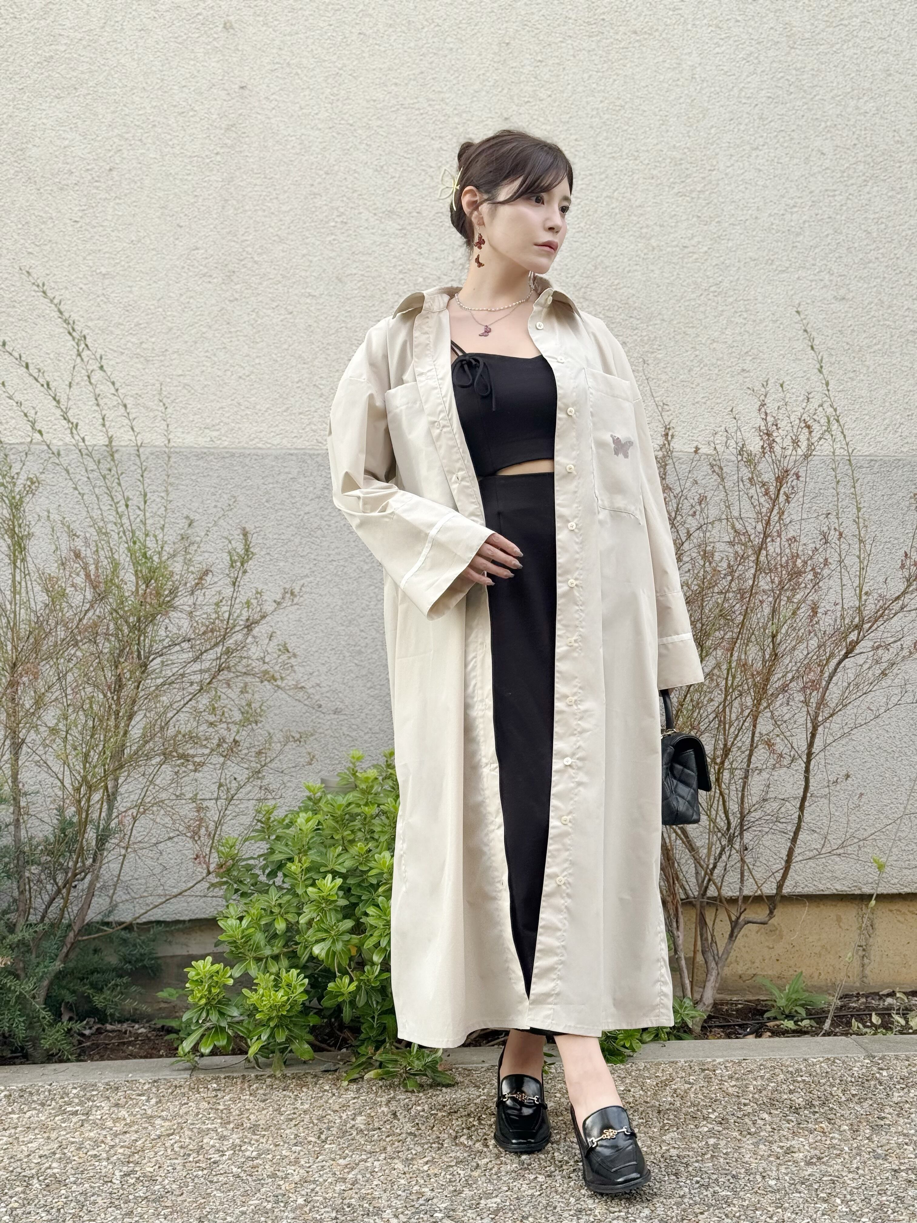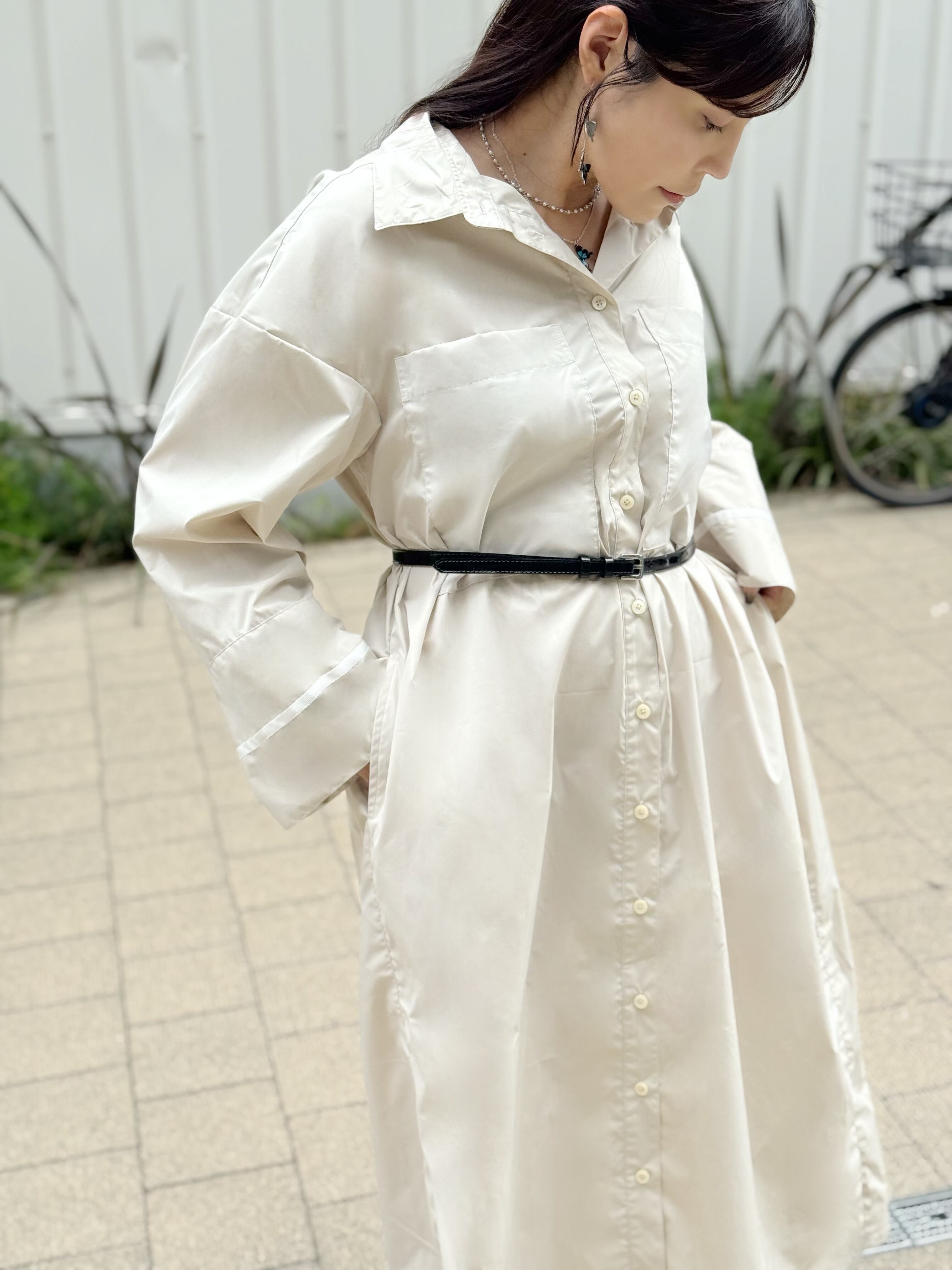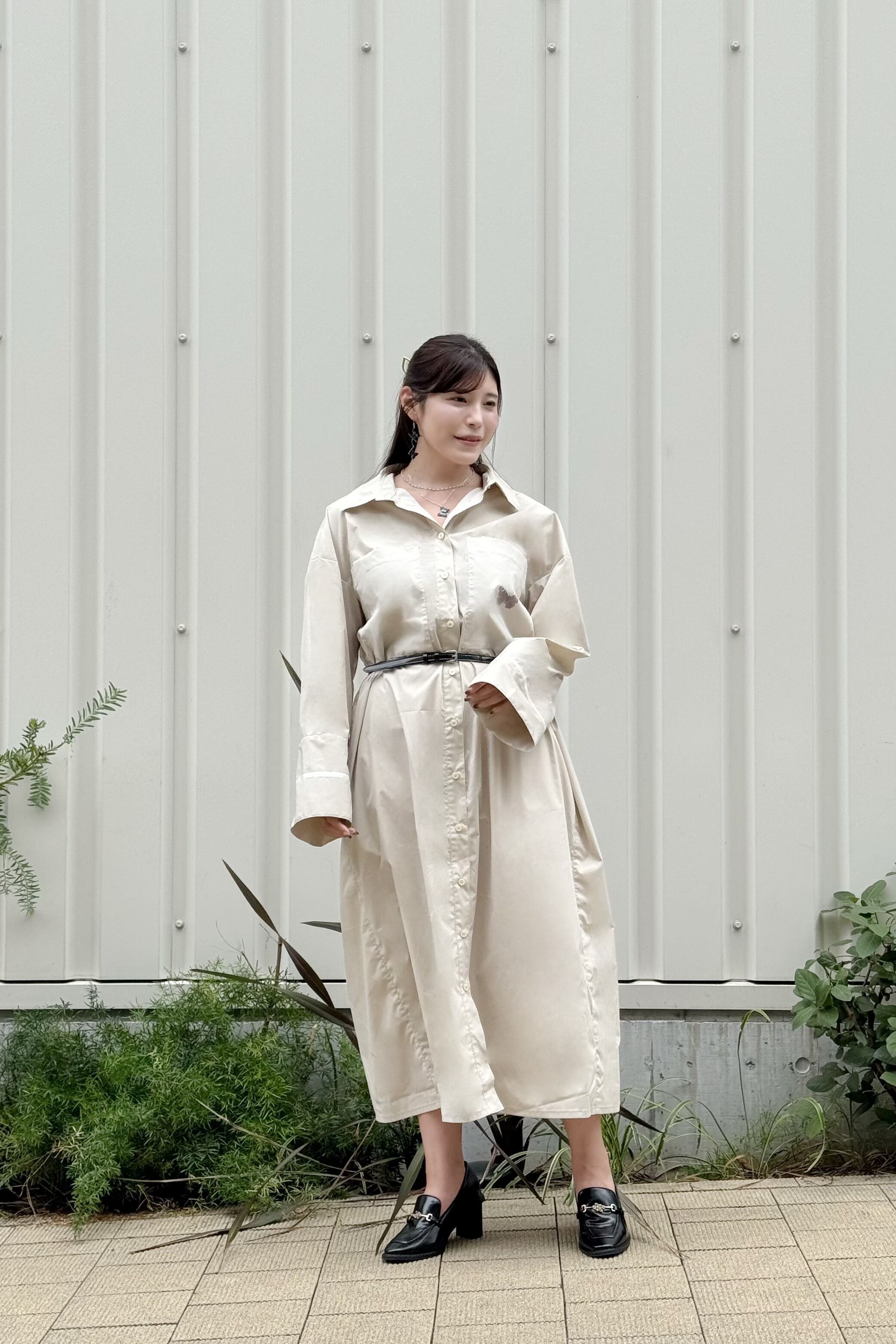 オーバーサイズのシャツワンピースで、ゆるっとしたシルエットが特徴。
