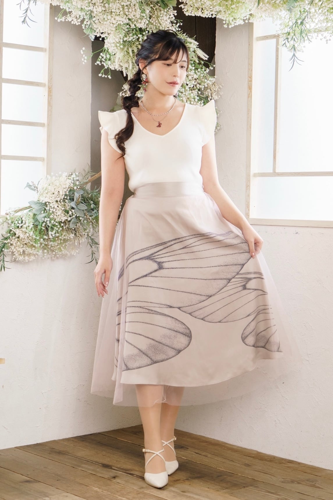 妖精のような透明感が美しいウスバシロチョウを、スカートの全面にあしらい、外面をチュールで仕上げました。