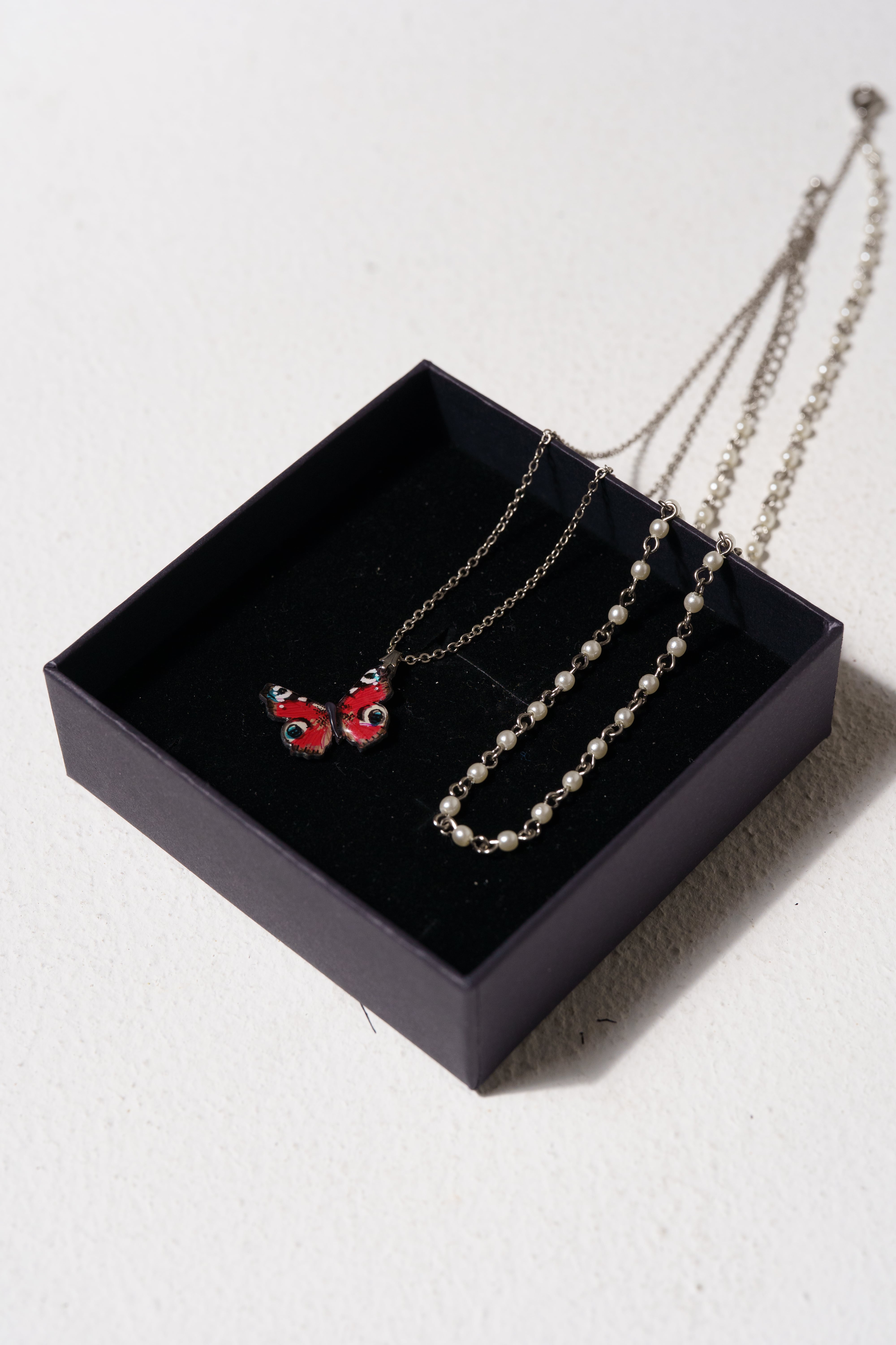 パール付き2連のネックレスにクジャクチョウのモチーフをあしらいました。