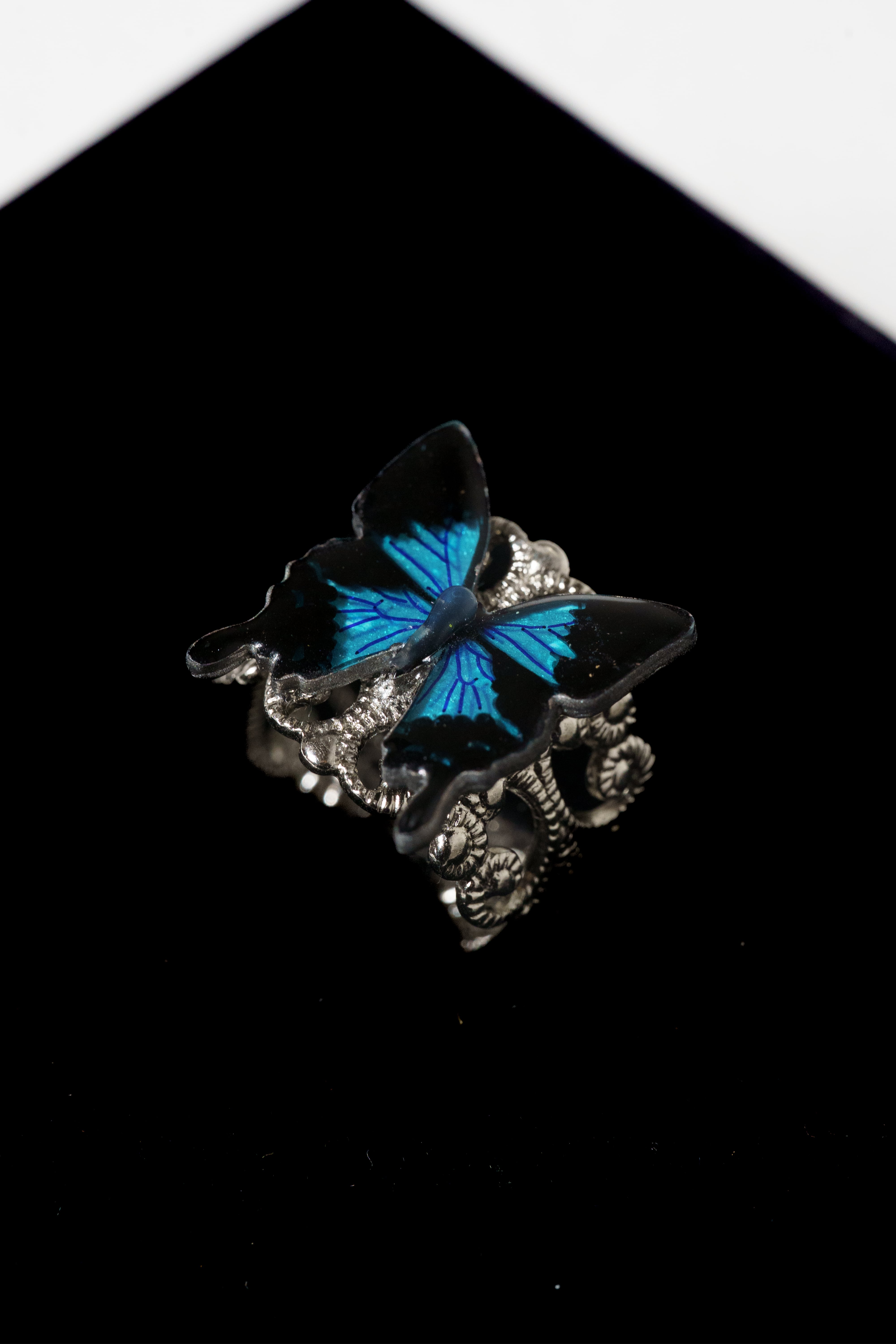 幸せを呼ぶチョウと呼ばれる、オオルリアゲハモチーフにしたクラシカルなリングです。