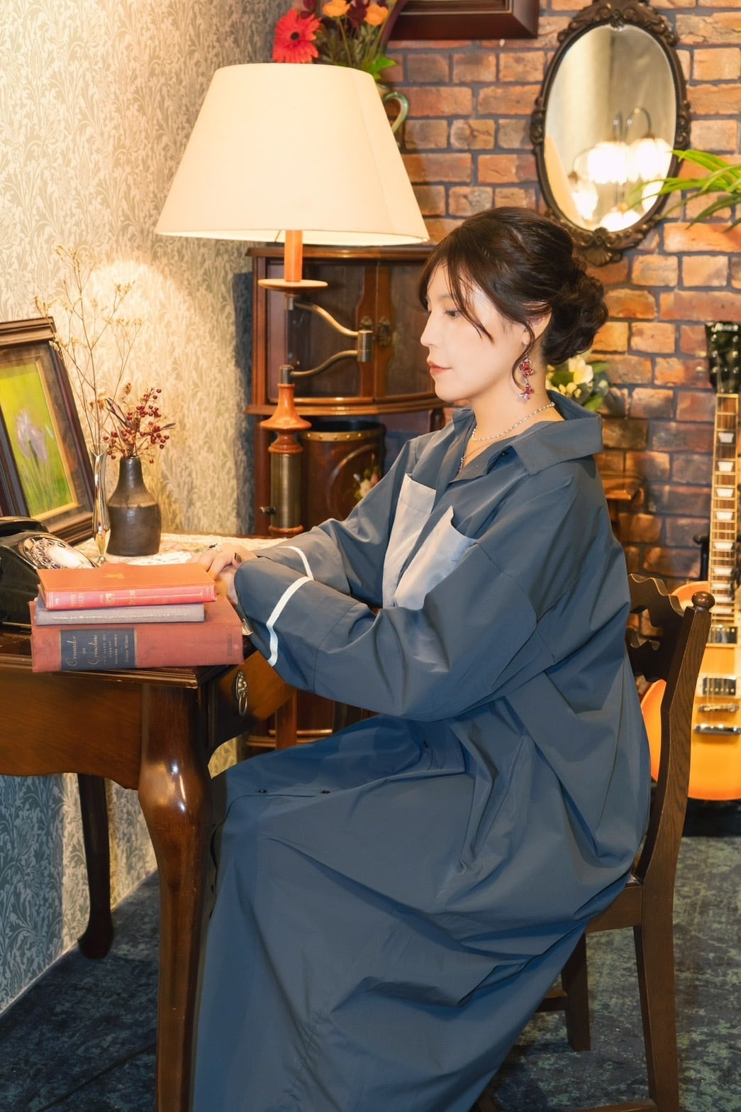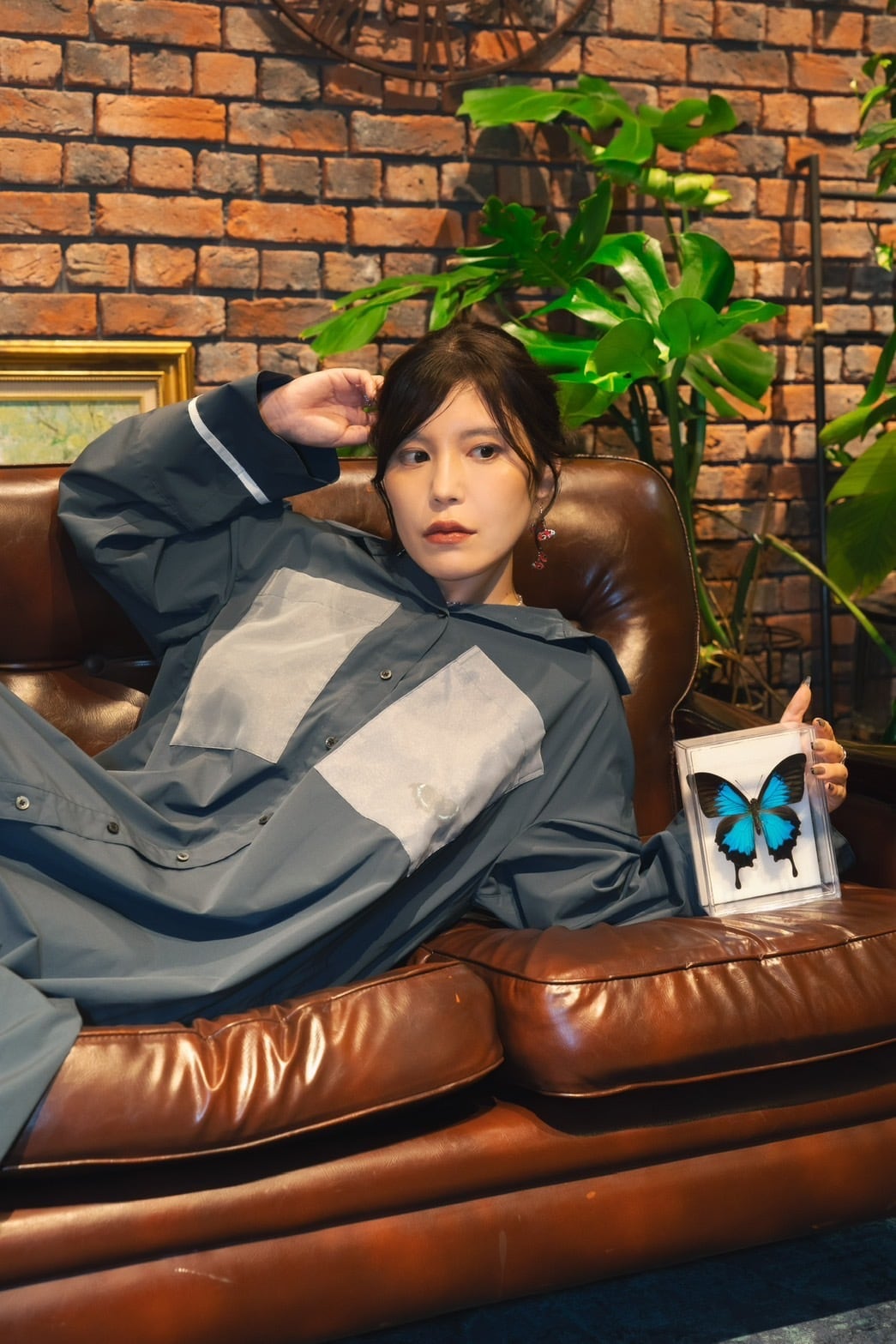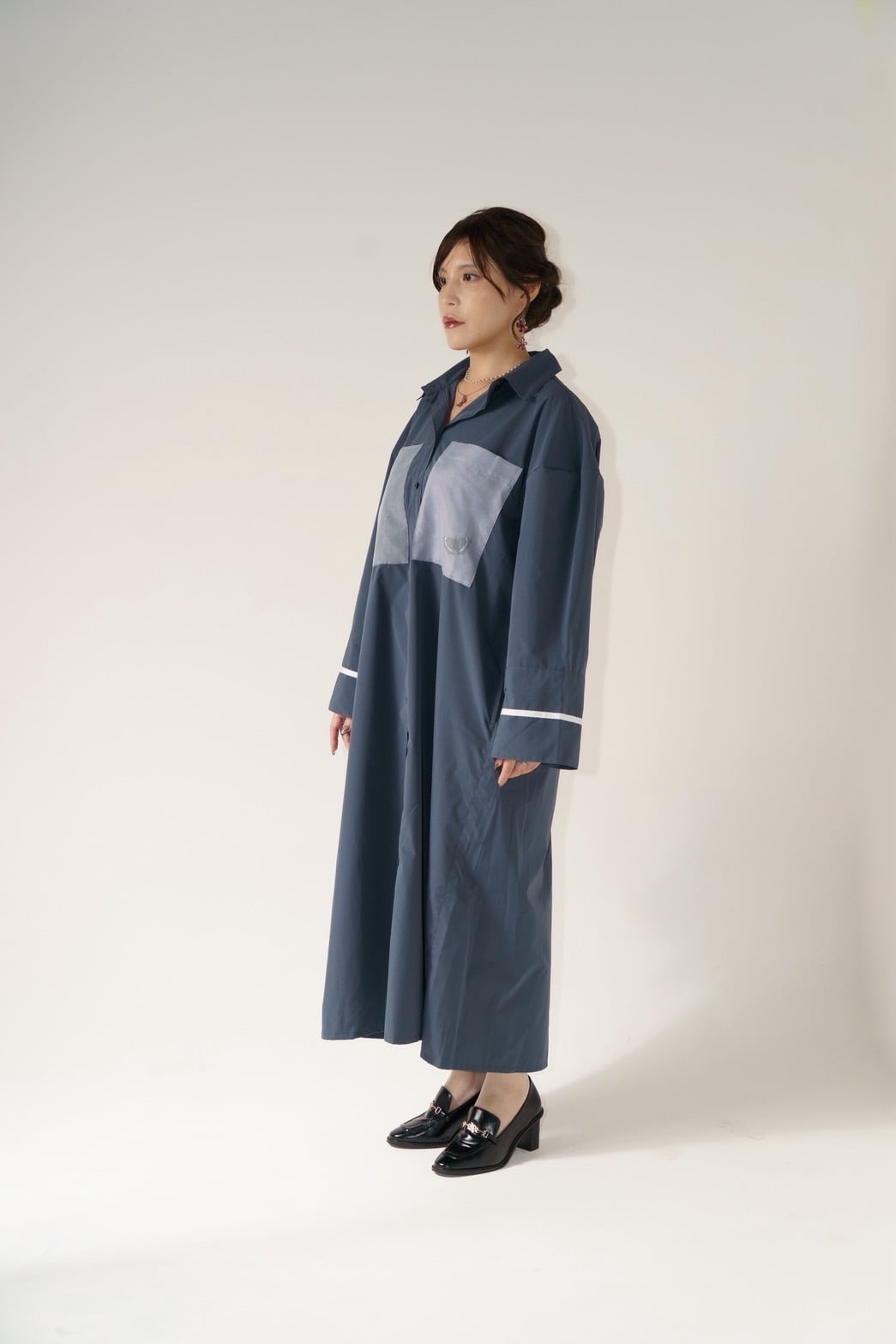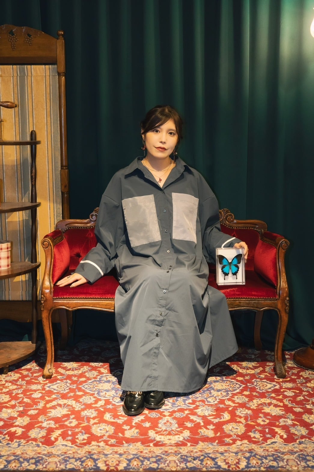 オーバーサイズのシャツワンピースで、ゆるっとしたシルエットが特徴。