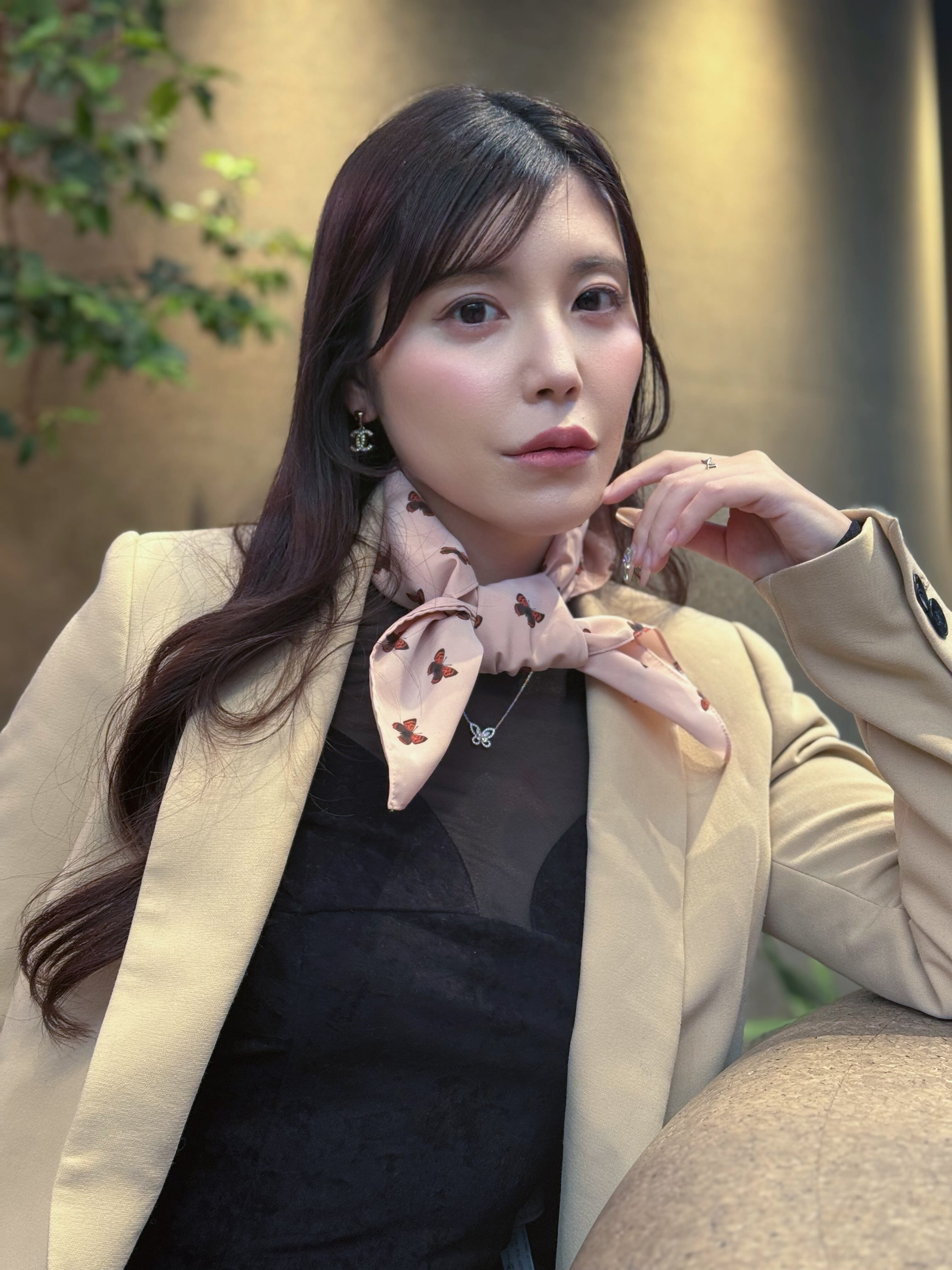 身近に見られるチョウですが、地面近くを飛ぶのでそのまま見過ごしてしまうことも。そんな可憐で美しいベニシジミを主役に、ドット柄で表現したスカーフです。