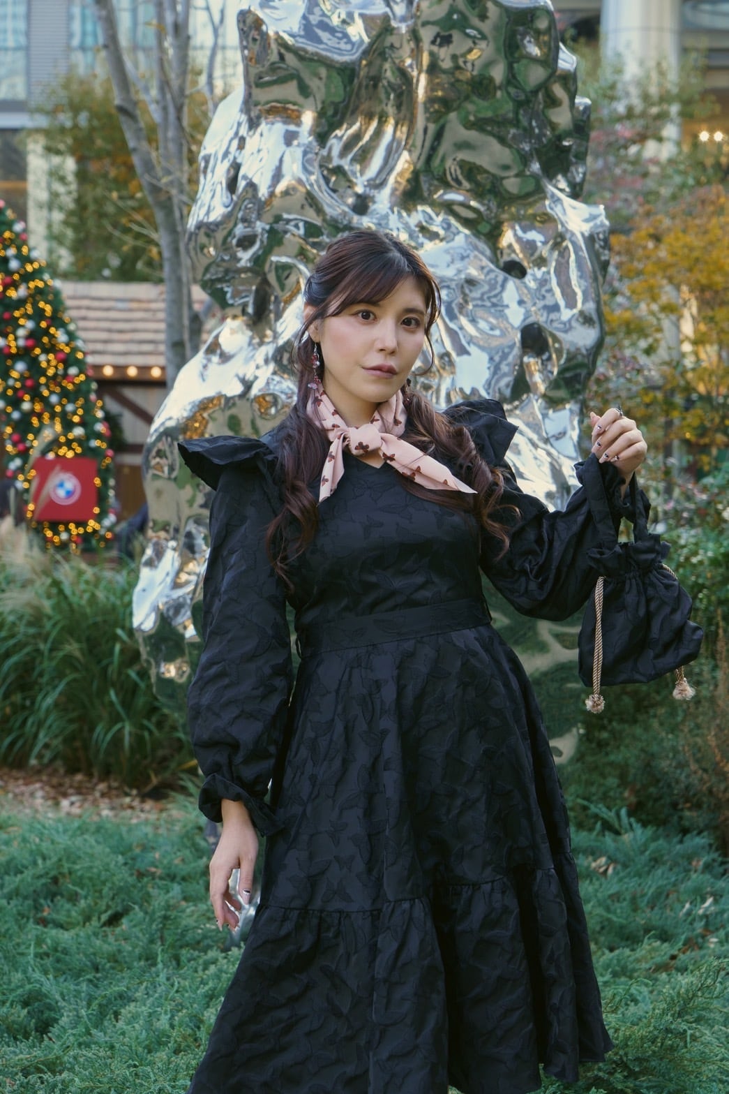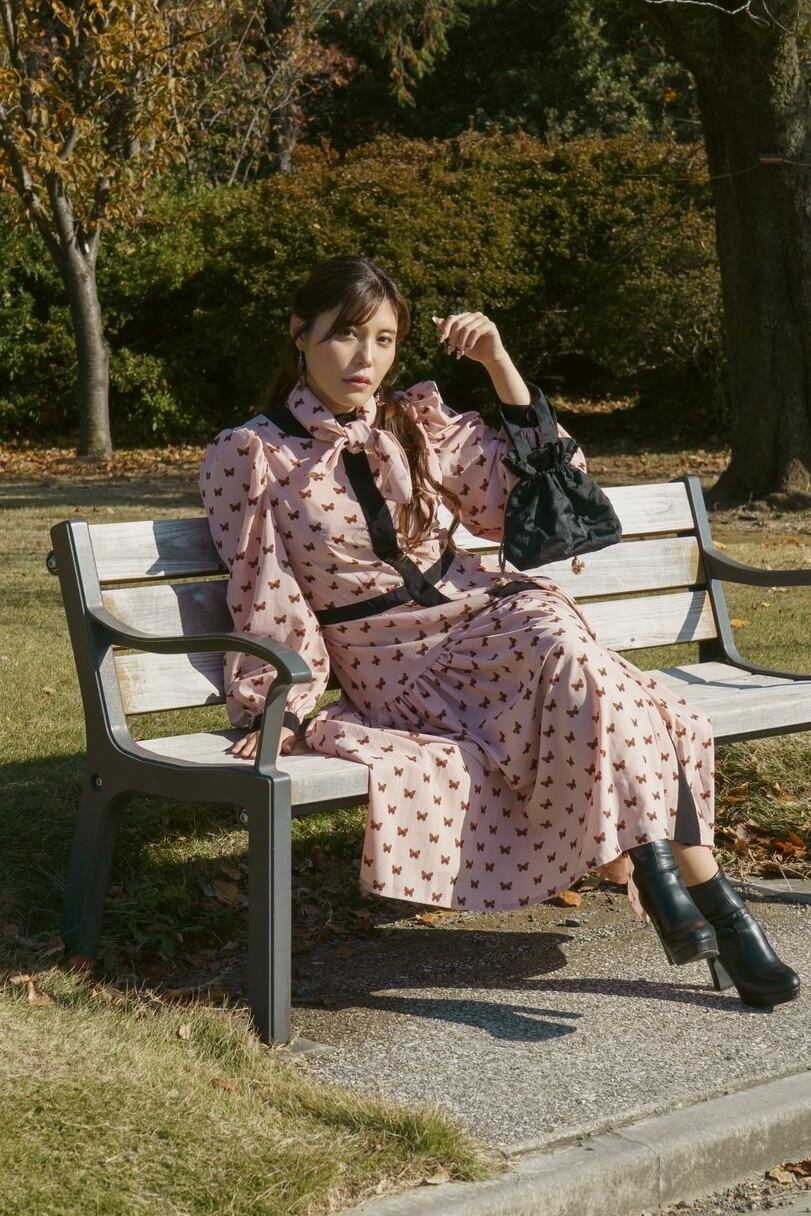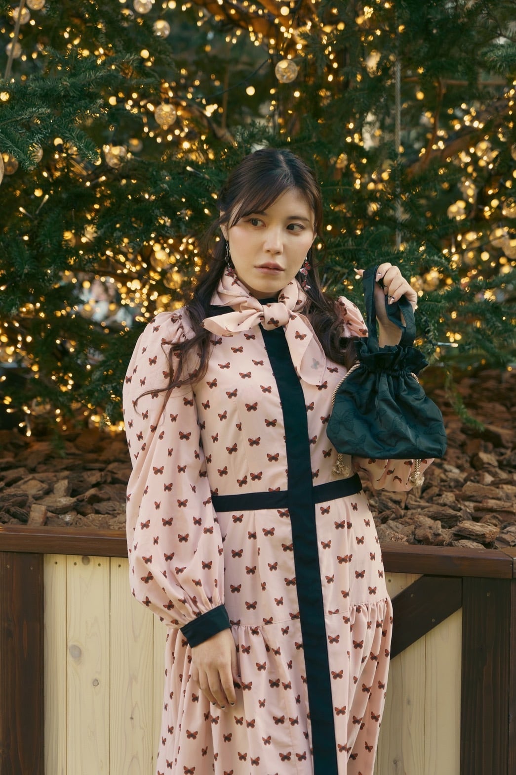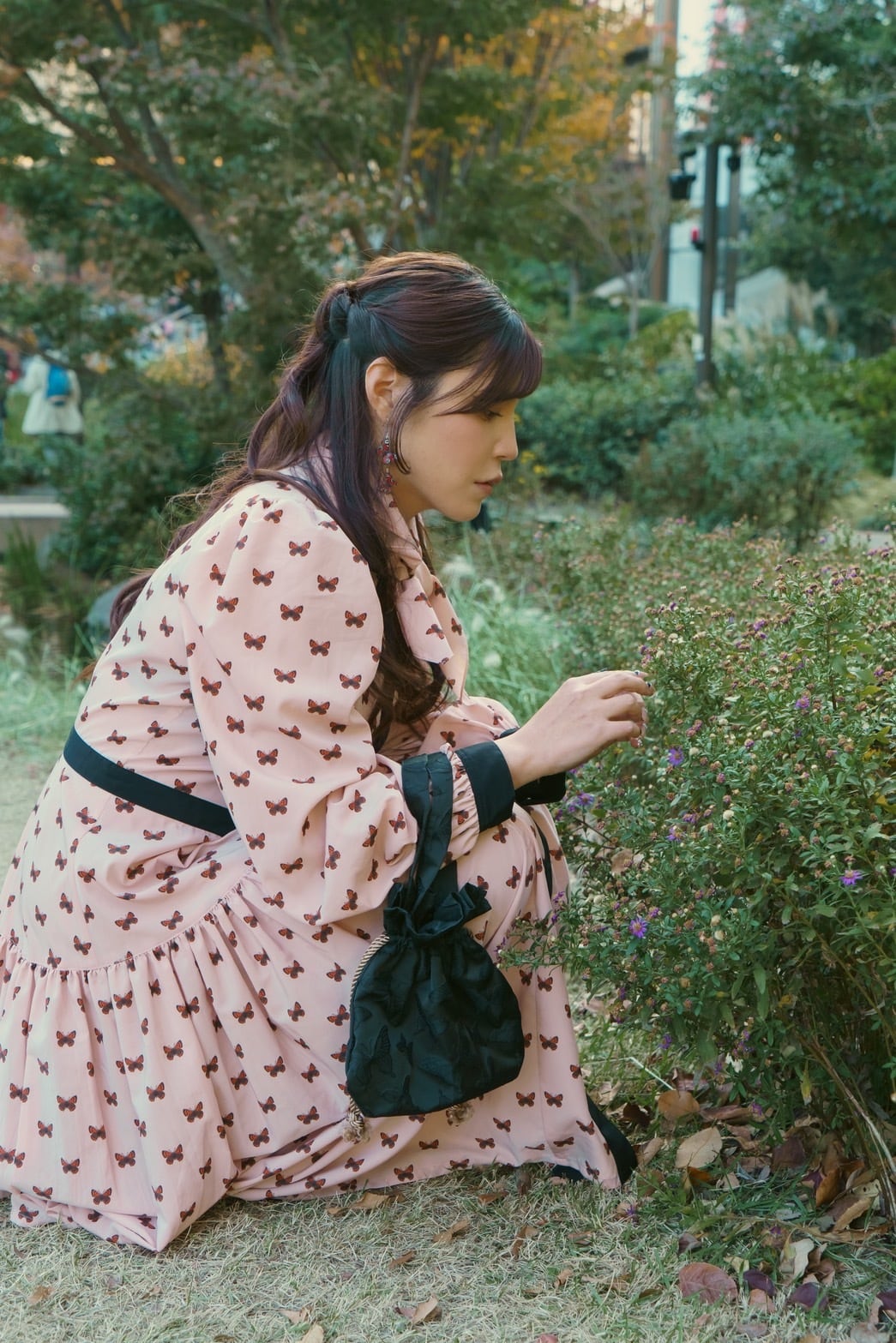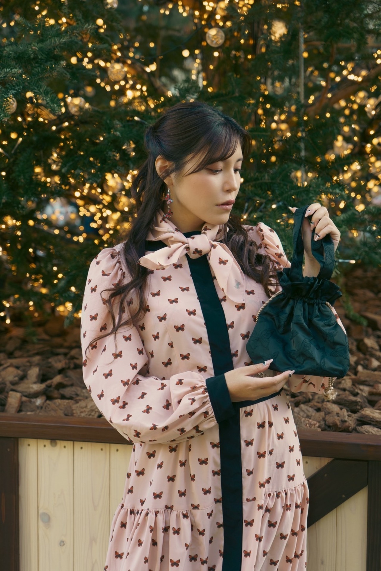 黒のジャガード生地にチョウがギッシリ散りばめられた巾着バッグ。